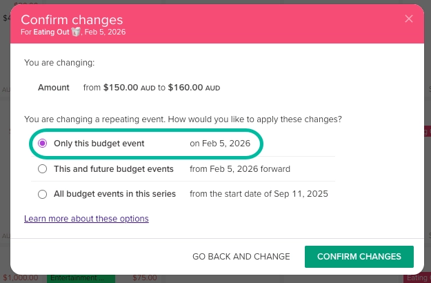Expenses don't always stay the same, so if you'd like to edit a repeating budget, you can choose to apply these changes to: