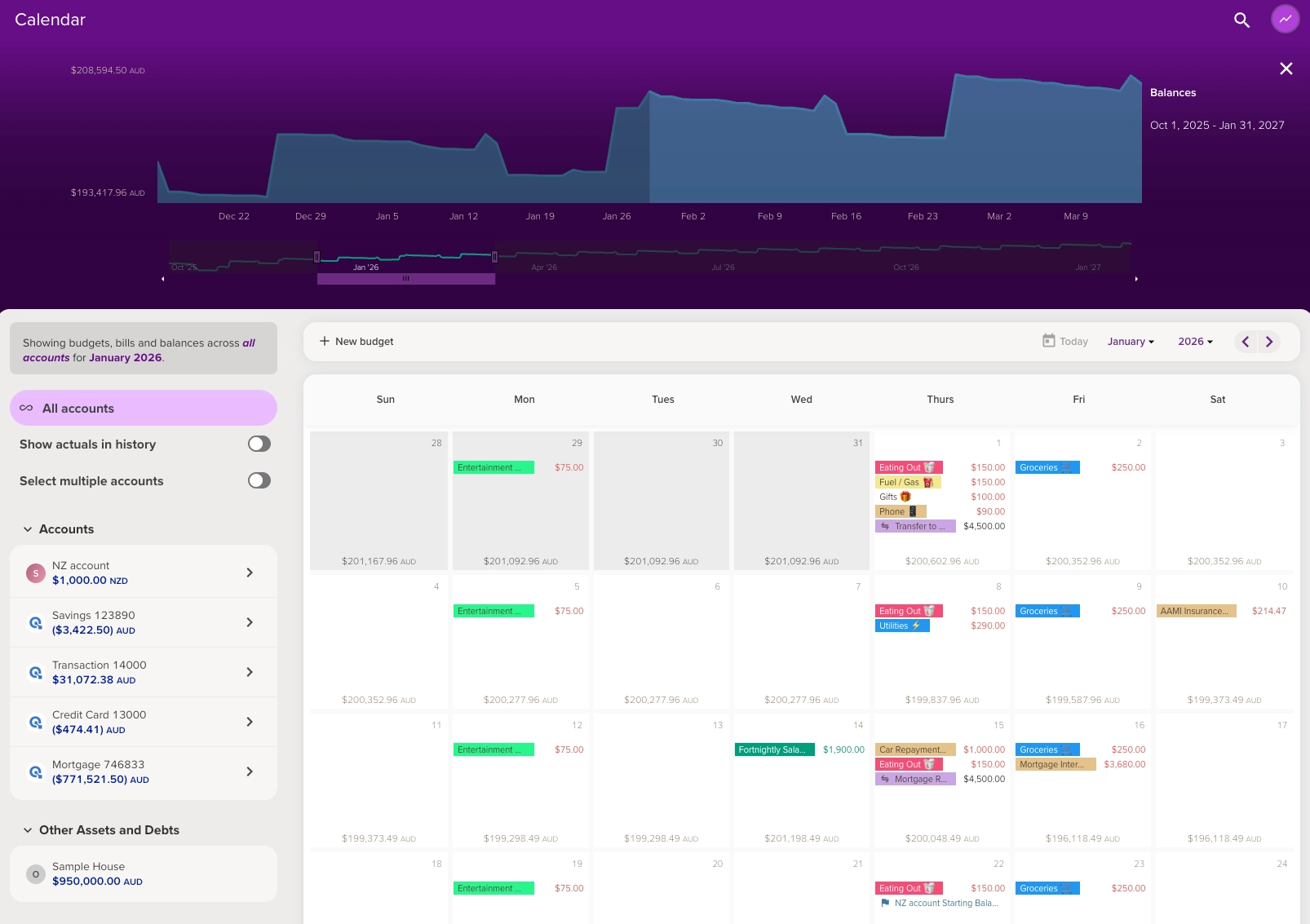 As well as helping you keep track of your earning and spending, PocketSmith uses your budgets to create your forecast - allowing you to predict your future financial position.