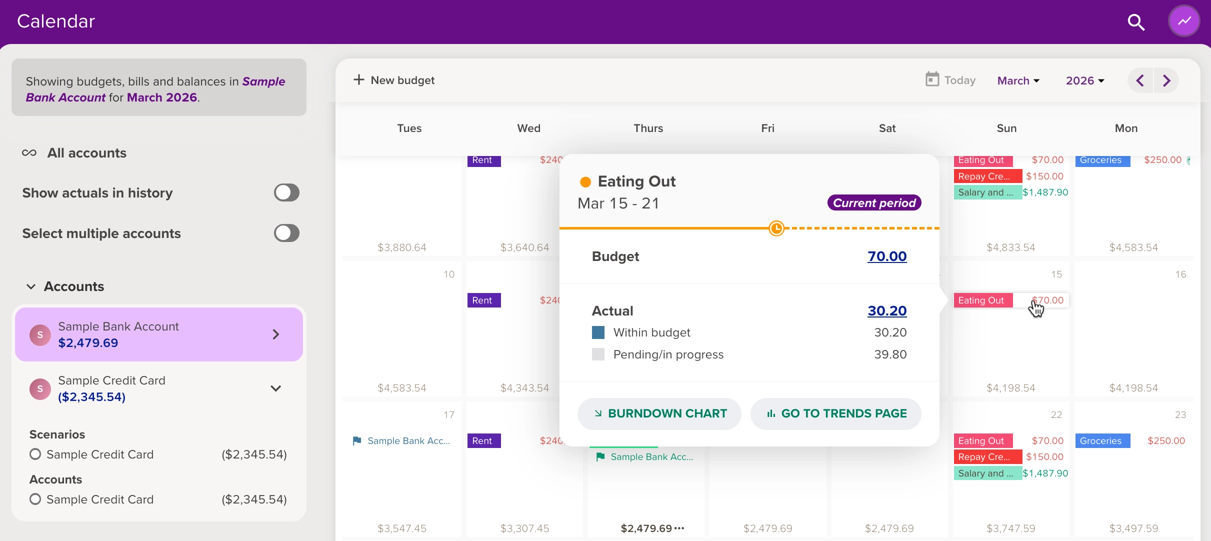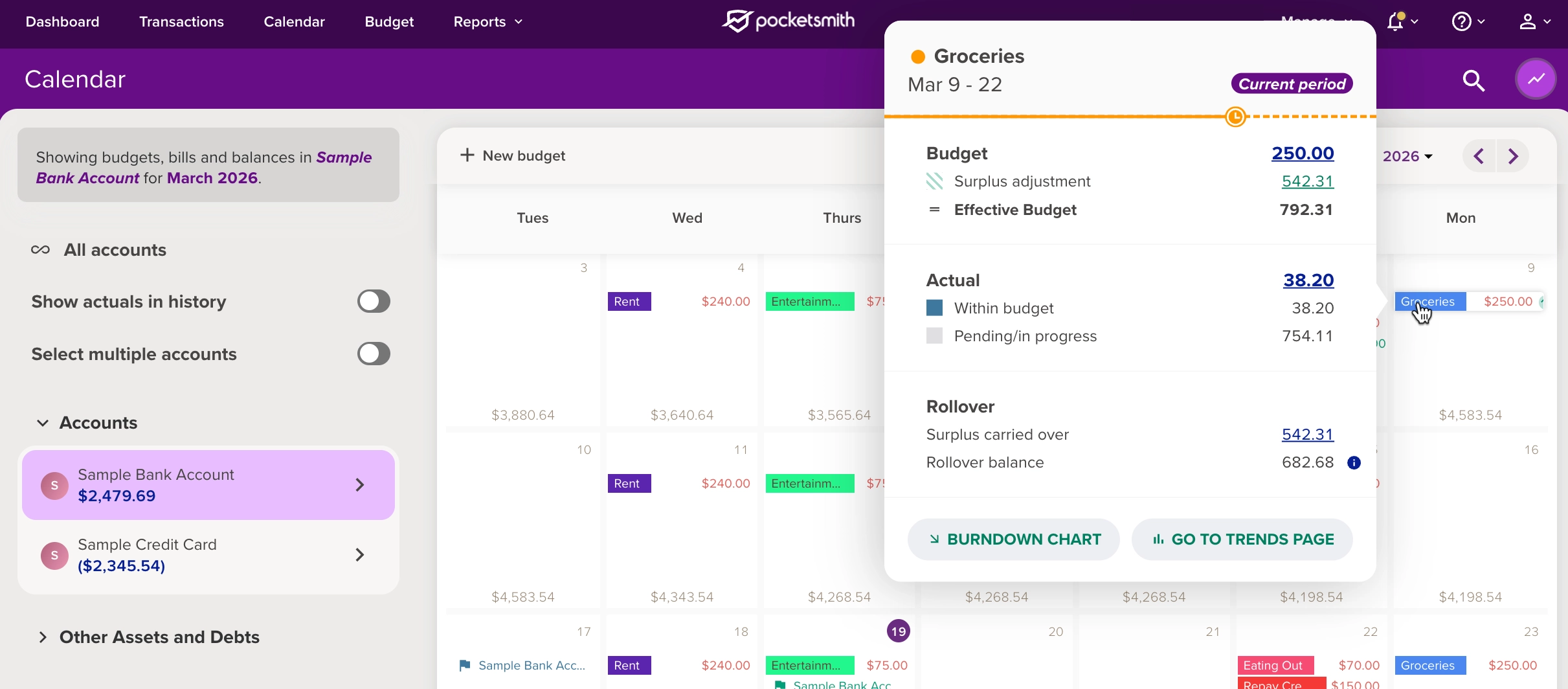 Extending from Example A, if you also had a $40 income budget planned that has not yet arrived, then your safe balance would be: $250 current balance, less the $80 Grocery budget, but plus $40 credit = $210 Safe balance.