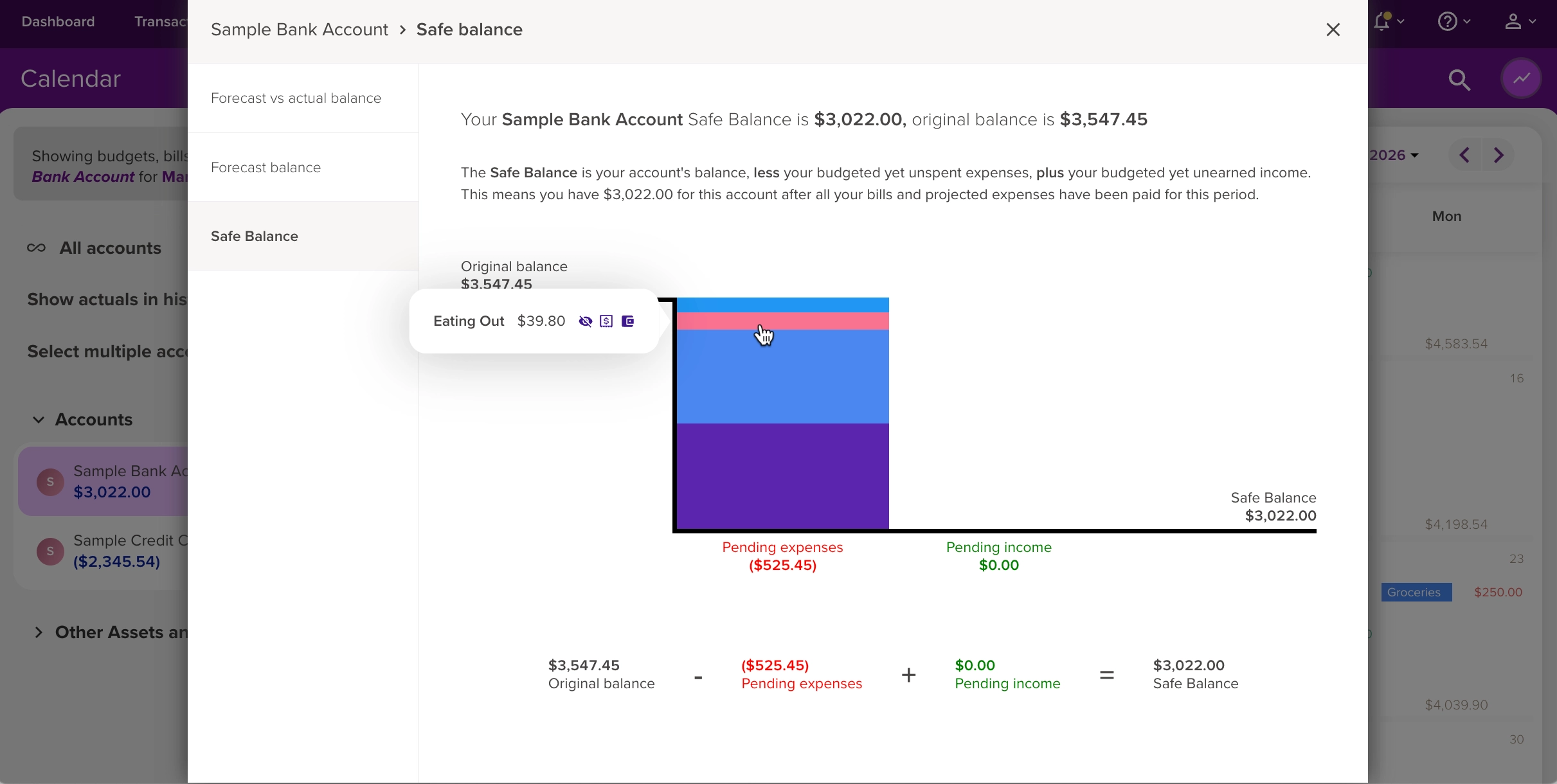 For a breakdown of how the Safe balance figure has been calculated, click on the informational tool tip beside the Safe balance in the pop-up