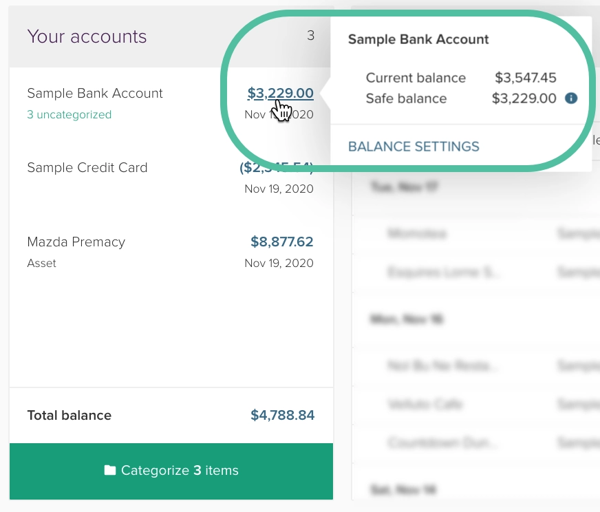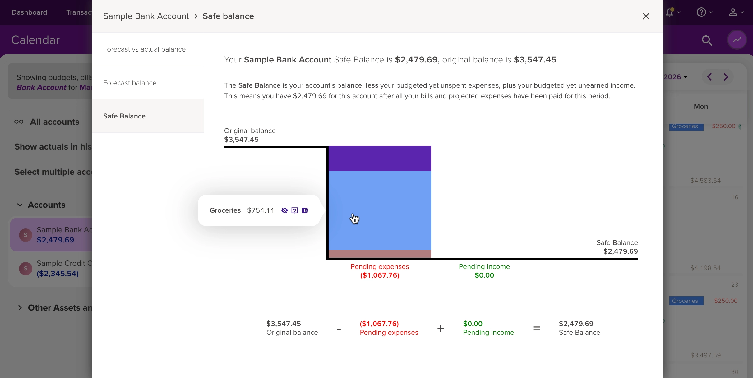 Assume you have $250 in your checking account. There is $80 remaining of a $120 Grocery budget. This will mean that your Safe balance would be: $250 current balance, less the $80 remaining in your budget = $170 Safe Balance.