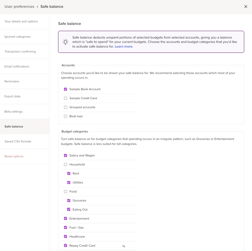 The Safe balance feature is activated on a per-account basis. We'd recommend that you turn it on for transactional accounts only (e.g. bank and credit card accounts), particularly those containing your variable budgets.