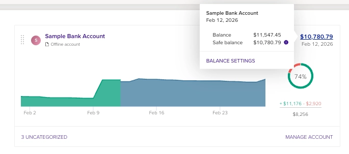 It pays to carefully curate the accounts you want to be included in Safe balance calculations. All accounts are de-activated by default and need to be turned on manually to activate the feature. We recommend that only transactional accounts (such as checking accounts) have Safe balance activated.