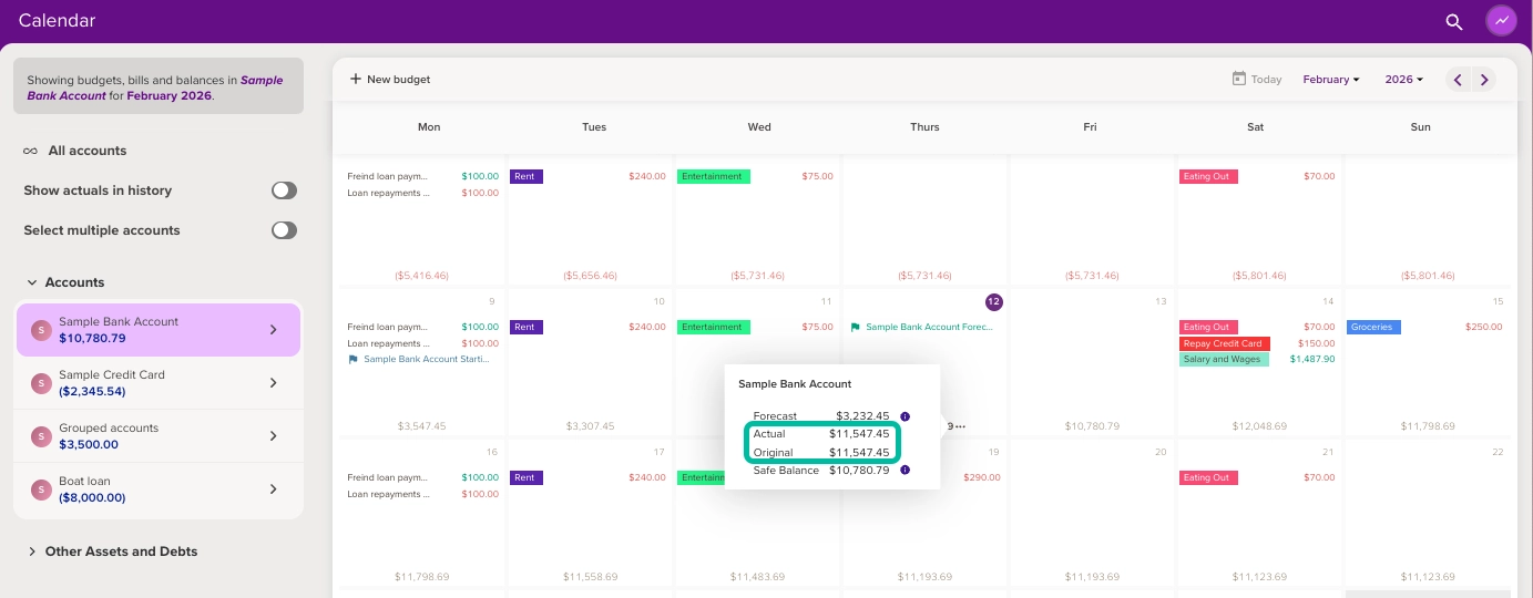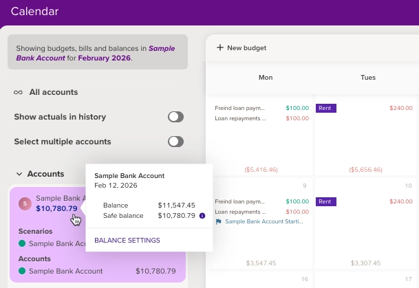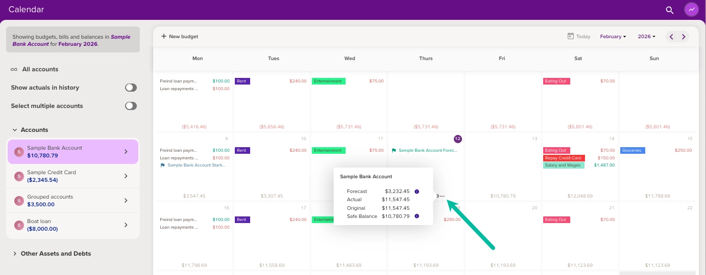 Once saved, your forecast will recalculate, and you'll see the Safe balance information pop-up next to your balances throughout the app - more on this below.