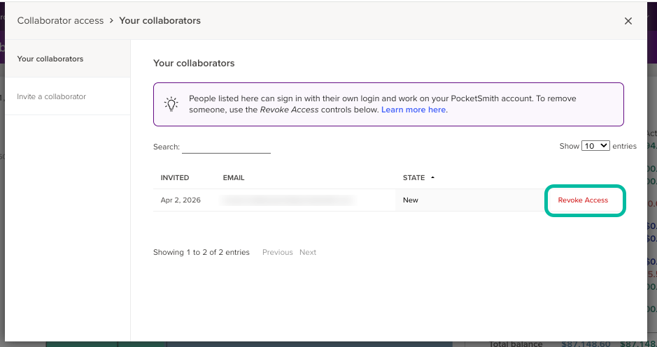 - Select Revoke Access beside the user you'd like to no longer have access to your PocketSmith account