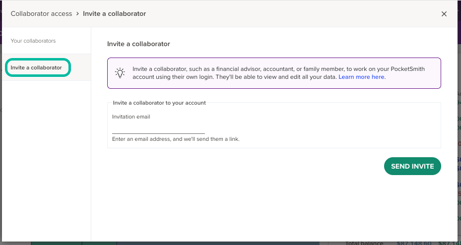 PocketSmith's Collaborators feature lets you invite another PocketSmith user — such as an advisor, friend, or family member — to access and manage your account alongside you without sharing your login details.