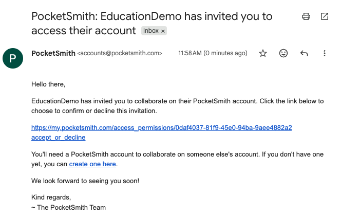 They will need a PocketSmith account to accept the invitation. There will be another link ("create one here") in the email where they can set up a PocketSmith account if they do not already have one:
