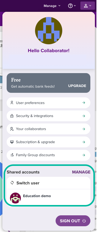 Otherwise, the Shared accounts options can be accessed from their Profile menu, as shown below: