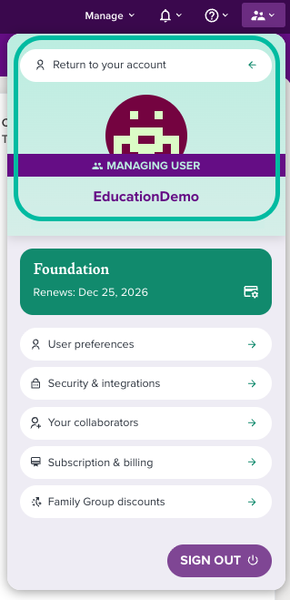 They can return to their own account by selecting 'Return to your account' at the top of the menu: