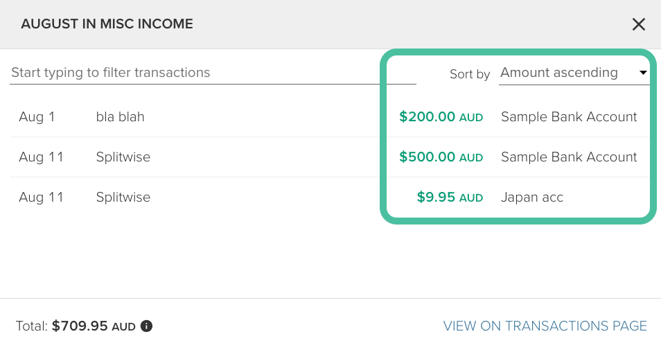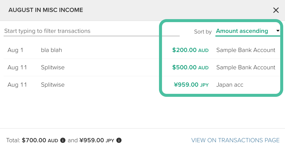 When a sort option is applied on the Transactions page, within the transactions pop-up, or within Dashboard widgets, transactions are ordered based on their unconverted amounts. This means that if you have transactions in multiple currencies, they will appear in order of the highest number in their unconverted form, which may not be accurate.