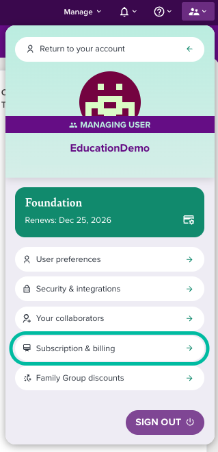 Once you have accepted your clients' invitation to manage their PocketSmith, use Collaborator access to view their account, and head to Profile > Subscription & billing: