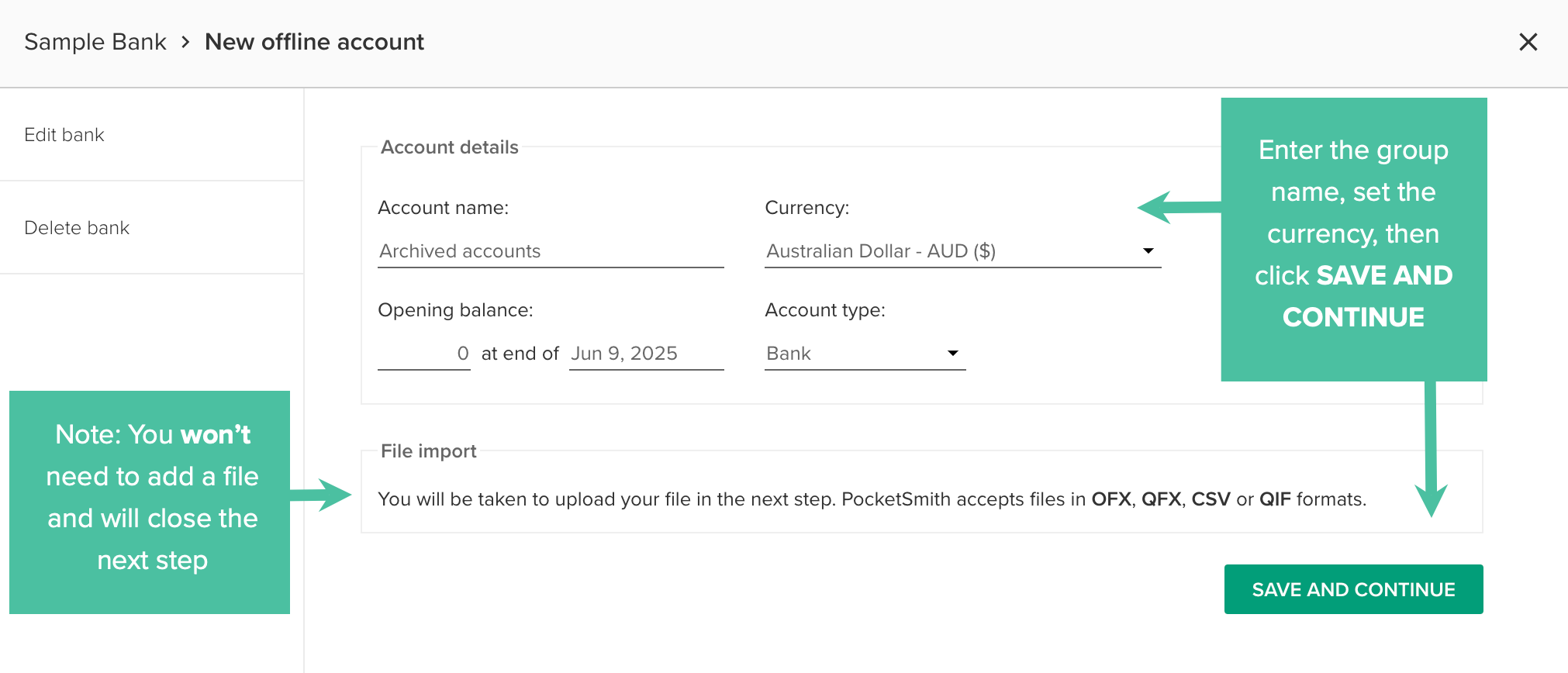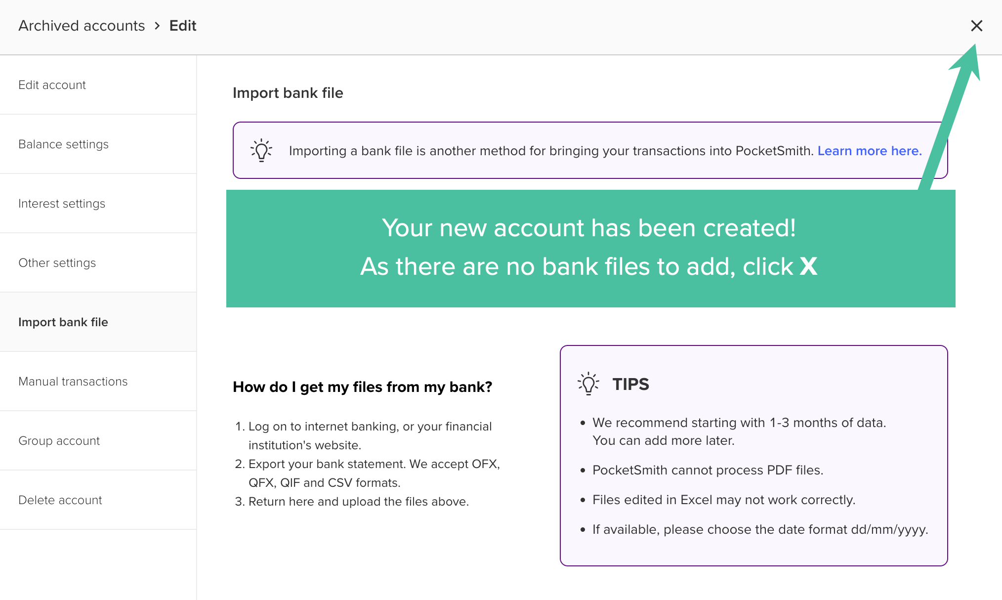 Your account is now created! Because you won't be adding bank files, click the X on the top of the form.