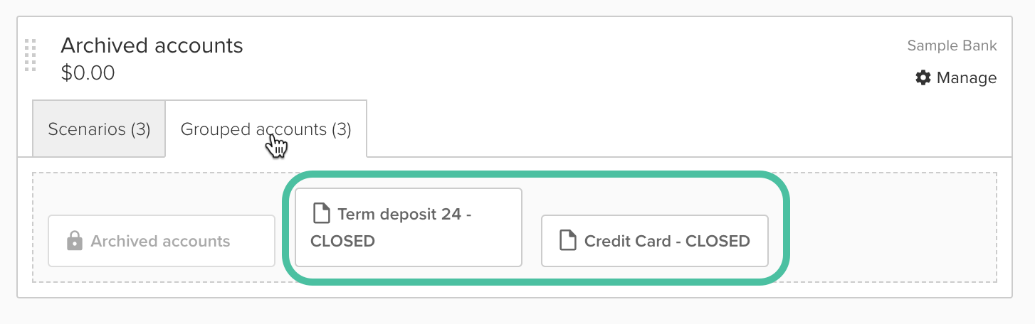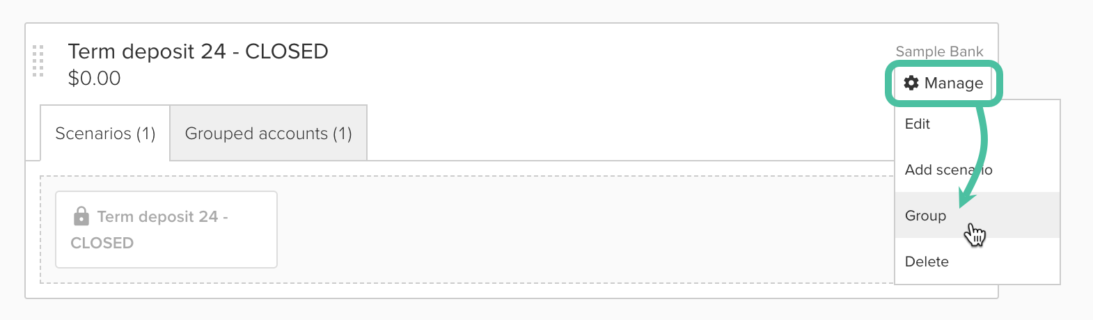 Your new grouped account will appear together on the Organize Accounts & Scenarios page, and you'll be able to see the accounts within the group