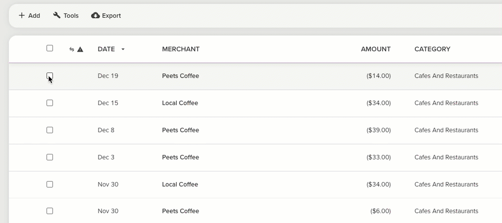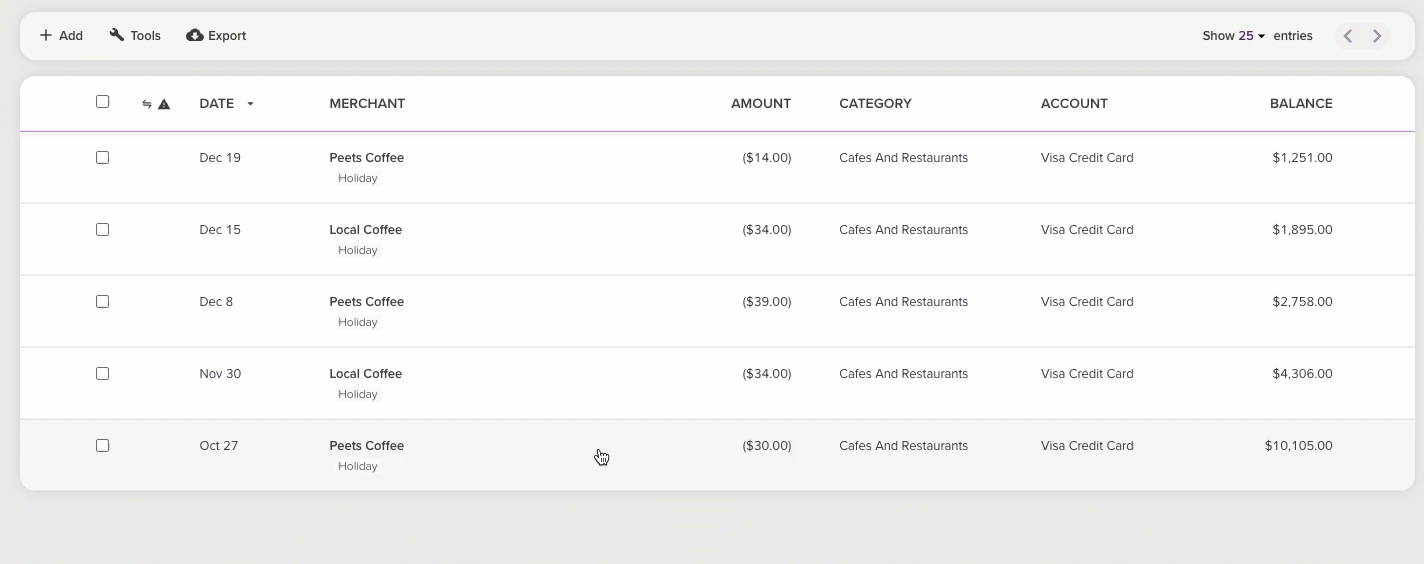 You can assign labels to your transactions from the Transactions page - either add labels to multiple transactions at once or, add a label when editing a single transaction.