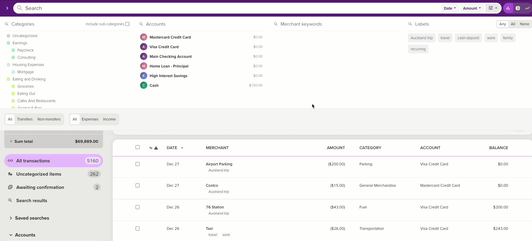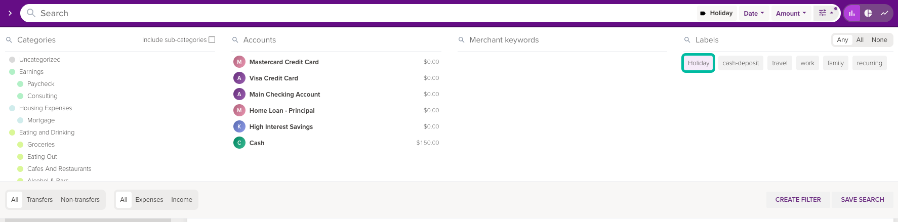 However, those same categories might also be used to categorize transactions unrelated to your holiday, making it hard to identify the total cost of the trip. This is where you can use labels to see similar transactions that fall into a number of different categories!