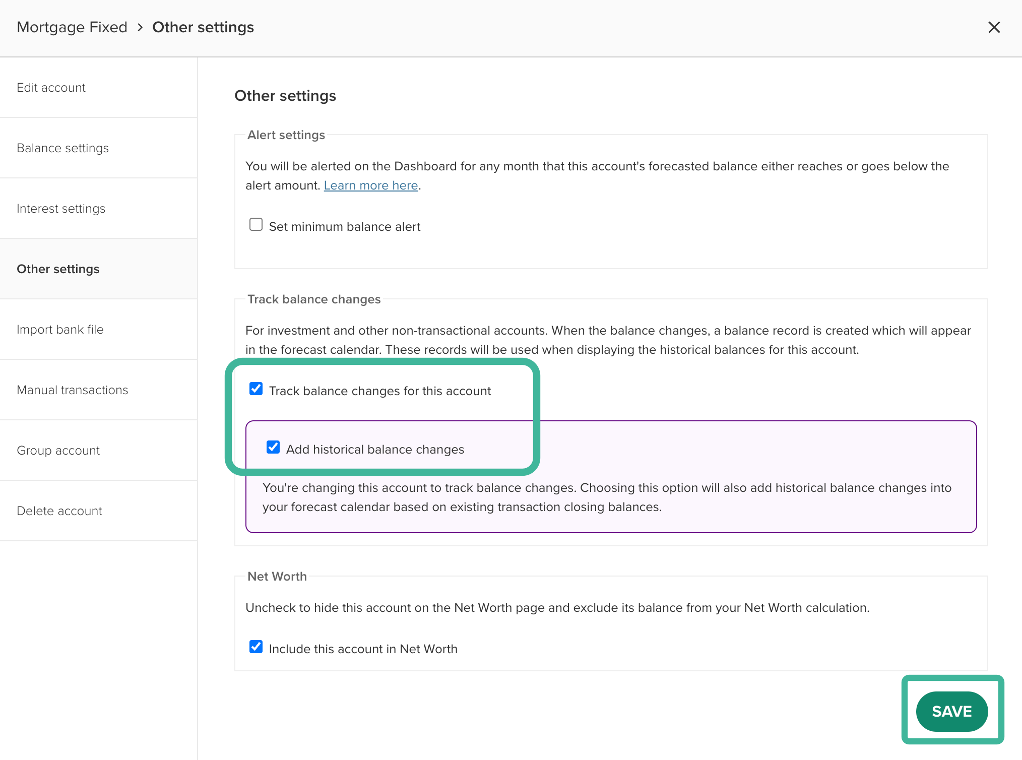 Tick Track balance changes for this account and the option to Add historic balance changes. Then click SAVE: