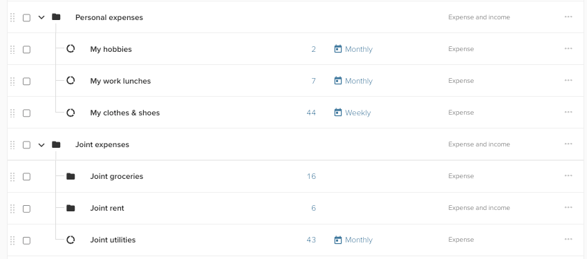 If you are looking to create distinct budgets for joint expenses and personal expenses, you may like to consider using parent/sub-categories. You can find more about this here: Sub-categories and nesting.
