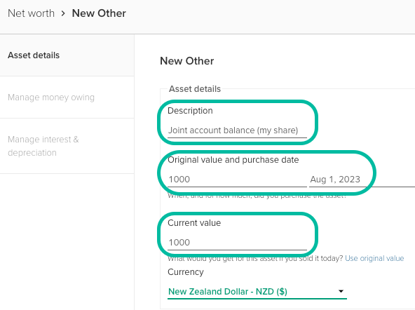 For example, if your joint account contains $2,000, you could add an asset for $1,000 and name it Joint account balance (my share) for example. To keep things simple, you can set the 'Original value and purchase date' to today's date and so the 'Current value' will be the same amount.