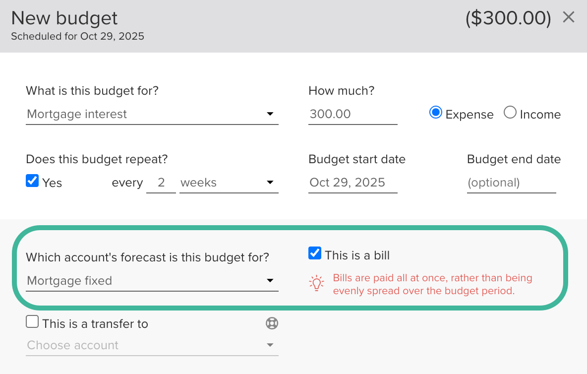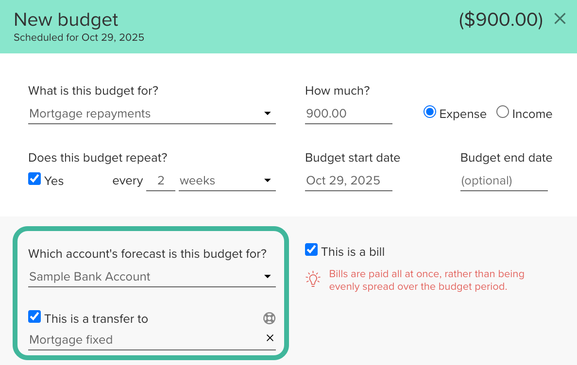 Users can still create budgets for mortgage payments if they are set up as transfers so that they can be tracked! With a transfer budget set up, PocketSmith will automatically match the credit transaction to the debit transaction (or vice versa) for that budget, which will allow the user to keep track of their mortgage payments, and also allow PocketSmith to be able to create an accurate forecast of their future account balances. Check out our user guide: Creating a transfer budget.