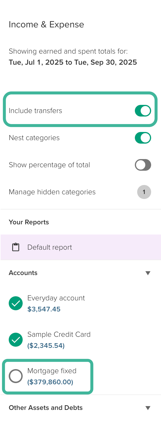 When creating your Income & Expense report, ensure that you toggle Include transfers on so that they are included in the report. In addition, ensure that your mortgage accounts are not selected: