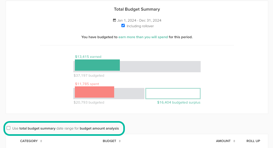 Untick the Use total budget summary date range for budget amount analysis option above your individual budget bars:
