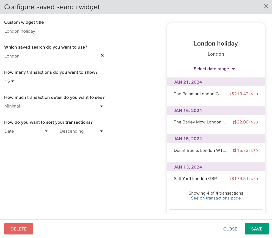 The below example illustrates the Saved search widget configured to show a Saved search for transactions with the 'London' label applied: