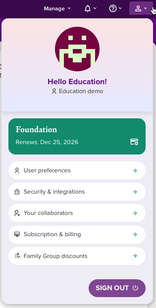 Head to the navigation menu in the top-right to check out or make changes to your account settings, preferences, or subscription.