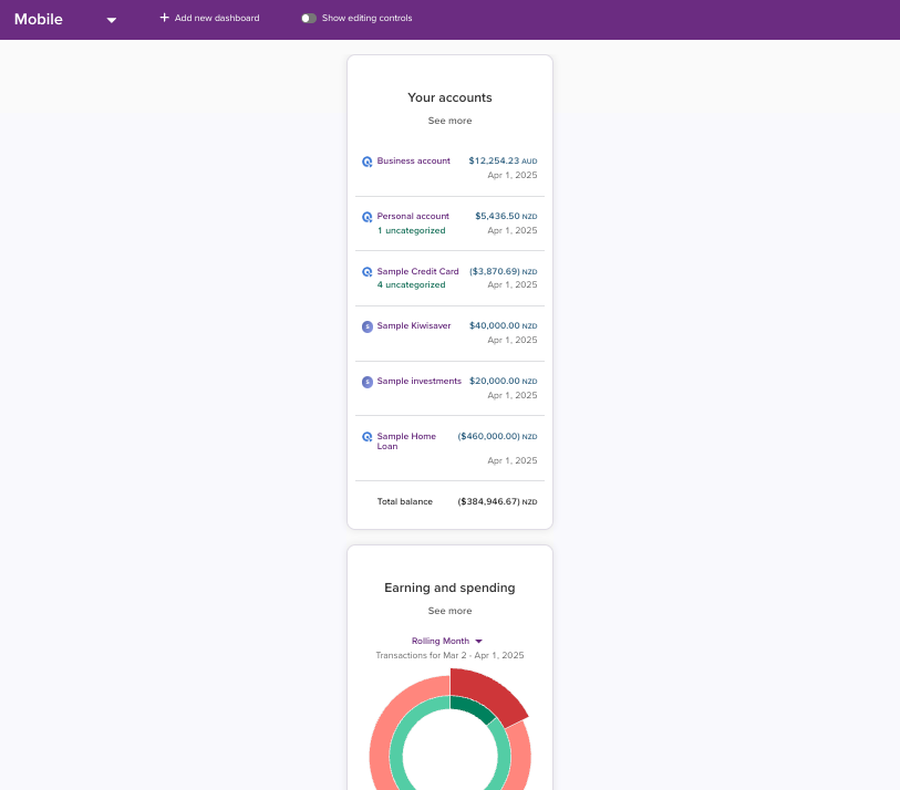 1. Head to the Dashboard on the PocketSmith web app, click +Add new dashboard and select 'Mobile dashboard'. Note, this will be easiest on a desktop or laptop computer