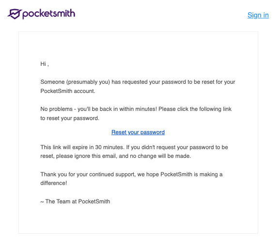 Make sure you have logged out of PocketSmith before trying to reset your password. Click here to logout.