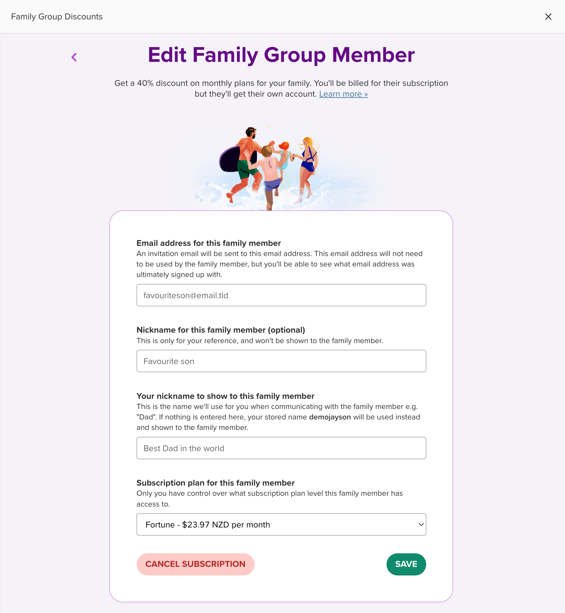 You can change the subscription plan, display names, or invite email for members of your Family Group at any time.