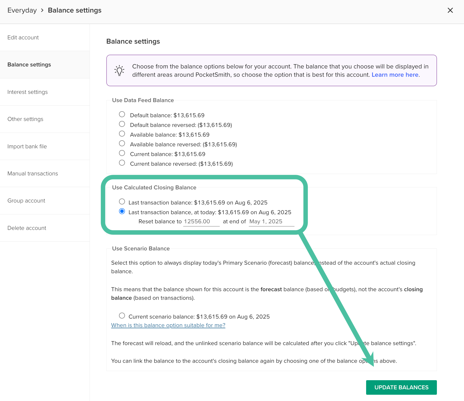 Next, re-select the balance option you had previously selected under 'Use Data Feed Balance' option and click Update balances again.