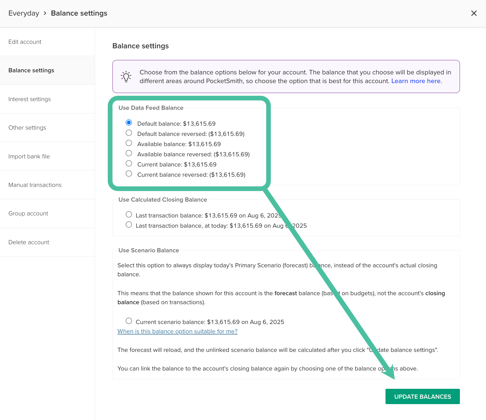 - Note the balance setting you are currently using under 'Use Data Feed Balance' 📝