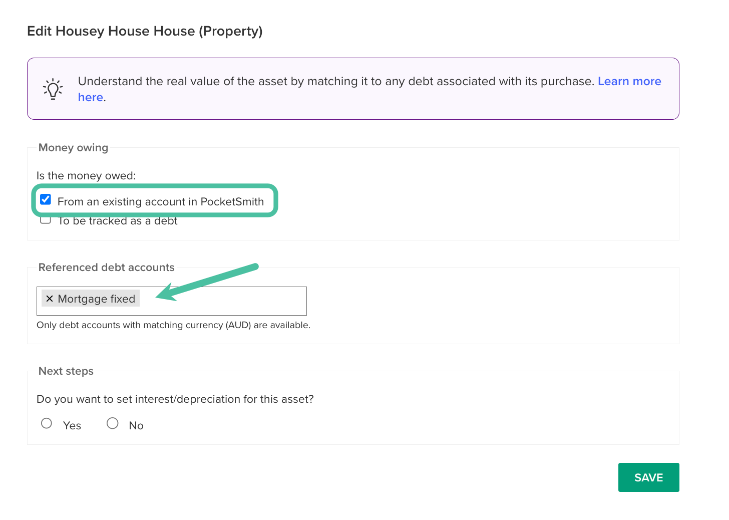 We recommend that you don't link your loan accounts or debts to your Asset and instead manage these as standalone loan accounts or debts.