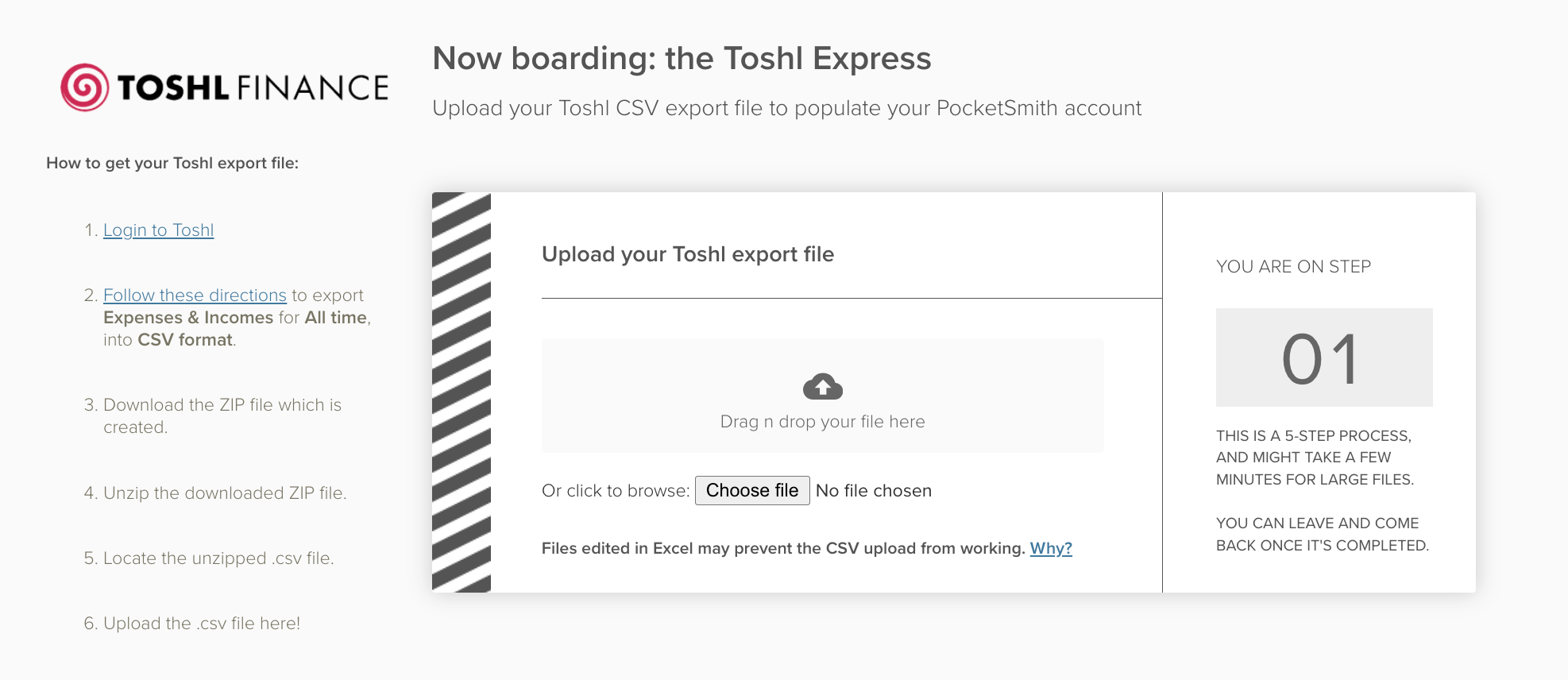 Drag-and-drop your Toshl CSV files directly onto the page, or click Choose file to select the file from your computer.