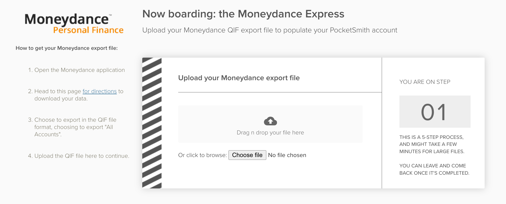 Once you've created your account at PocketSmith, you're all set to get your Moneydance data imported. The Moneydance import tool allows you to upload your QIF file to PocketSmith, recreating all your categories, transactions, accounts, and financial institutions.