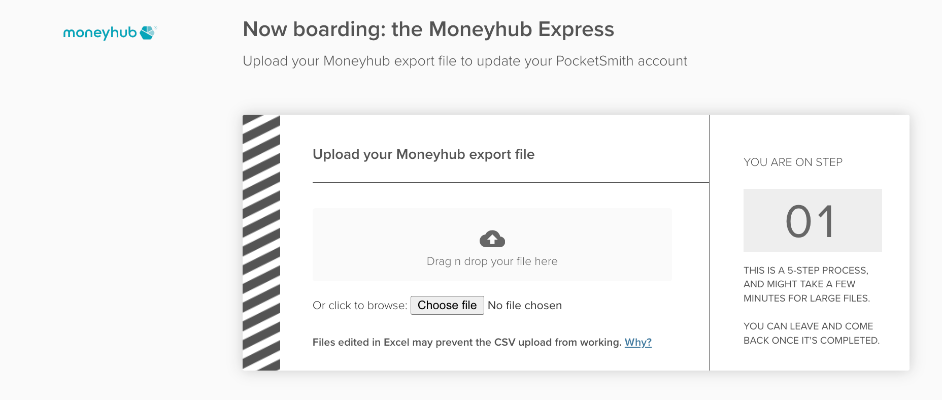 Drag-and-drop your Moneyhub CSV file directly onto the page, or click Choose file to select the file from your computer.