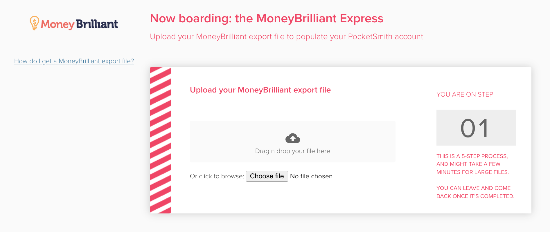 MoneyBrilliant has closed down, and it's no longer possible to sign in to their app to export data. However, if you downloaded your data into an XLSX file before MoneyBrilliant closed, you can import this file into PocketSmith.