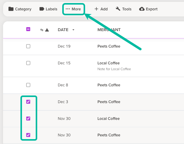If you would like to edit multiple transactions at the same time, the following actions can be applied in bulk: