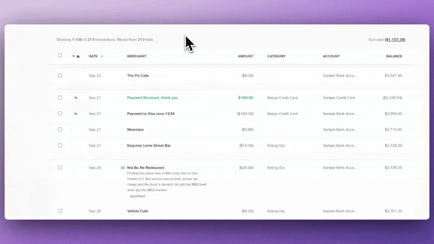 Similarly, if a Filtered button is displayed, this means the transaction has been edited in some way by a filter or category rule, hover over the button to see the details of the filter or category rule.