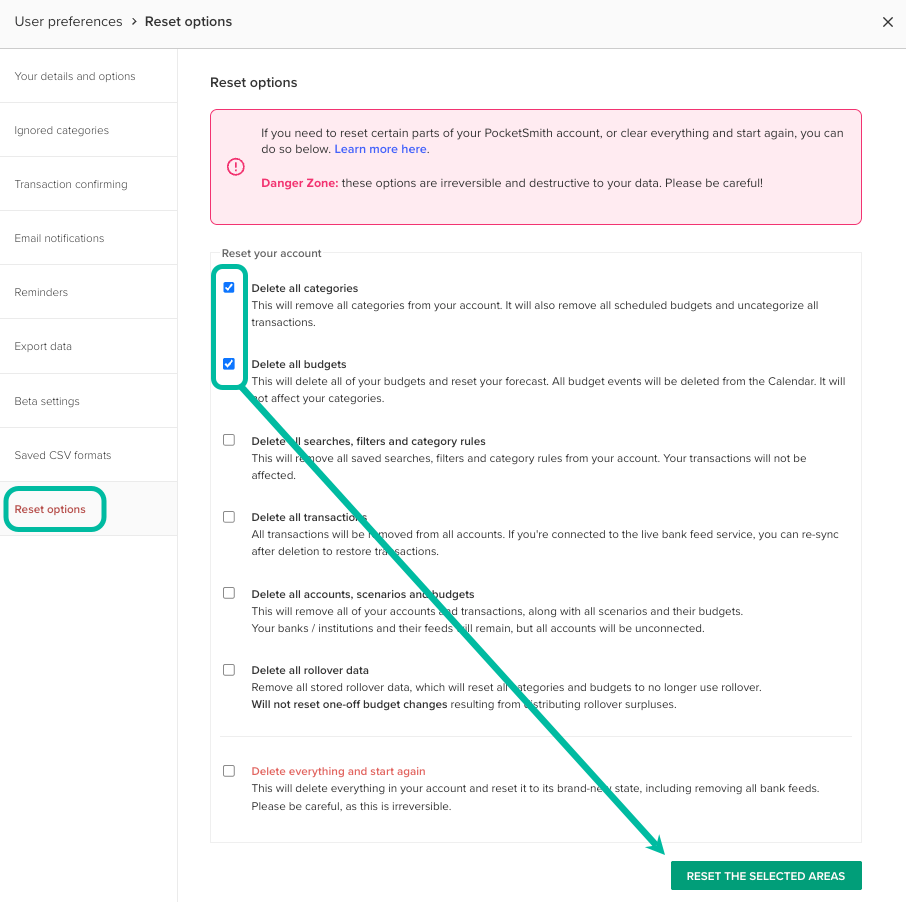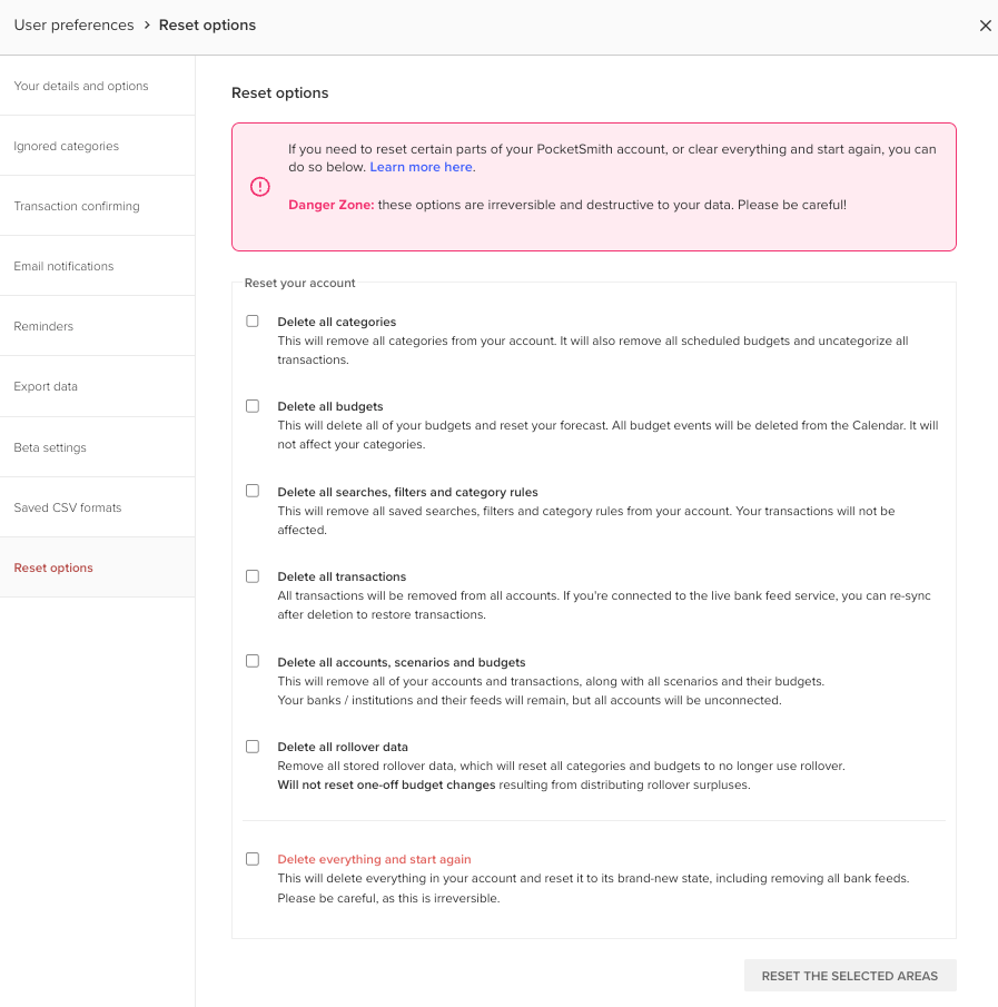 There are a few different reset options: you can delete certain attributes of your PocketSmith account, such as just removing categories and budgets; or you can reset your whole PocketSmith account entirely and start again from scratch.