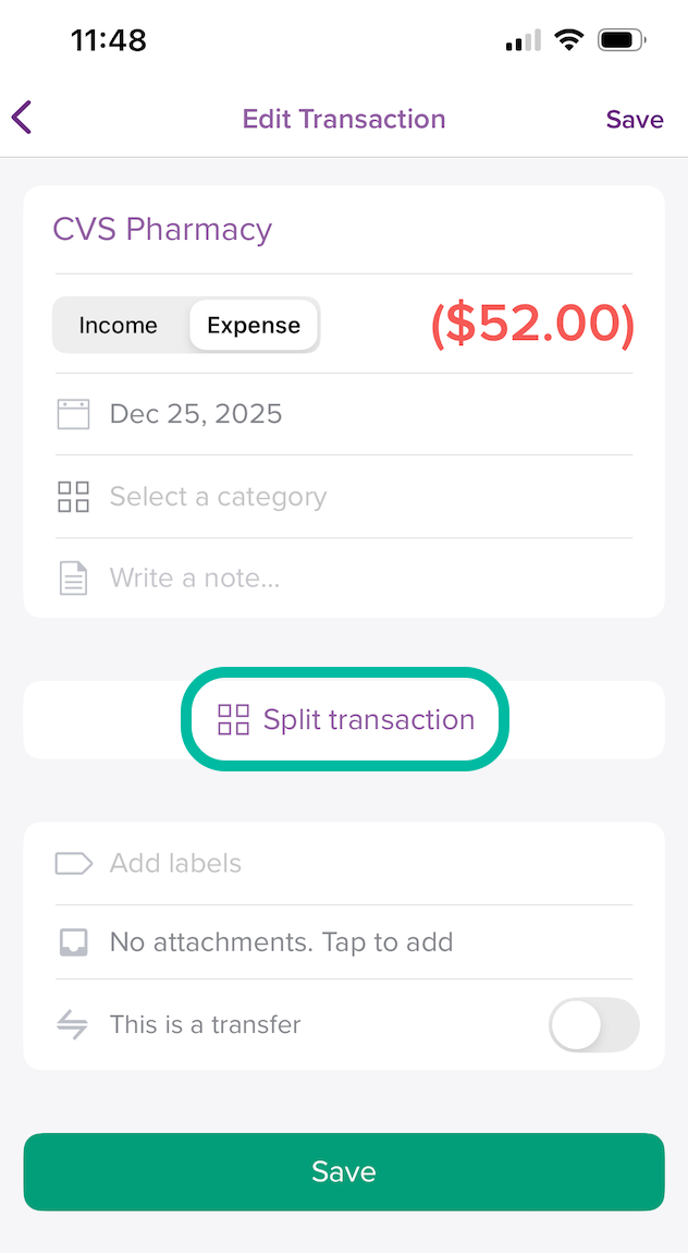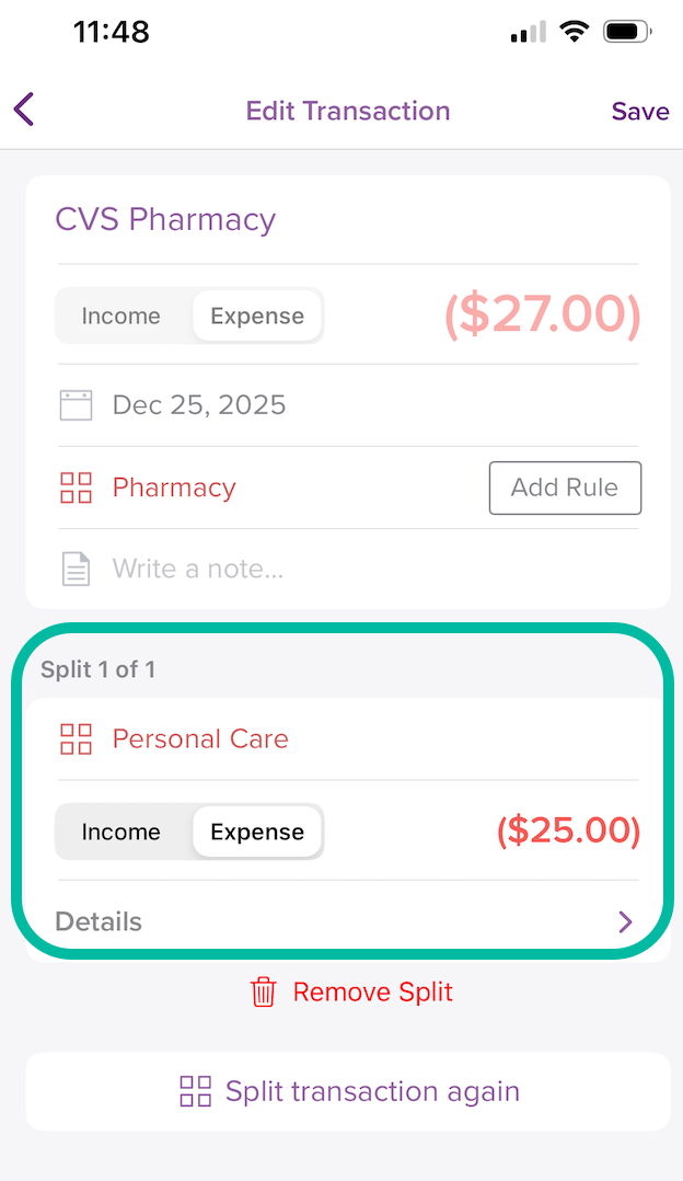 - The amount of the original transaction will update to reflect this new balance automatically. Apply the category you would like to this split