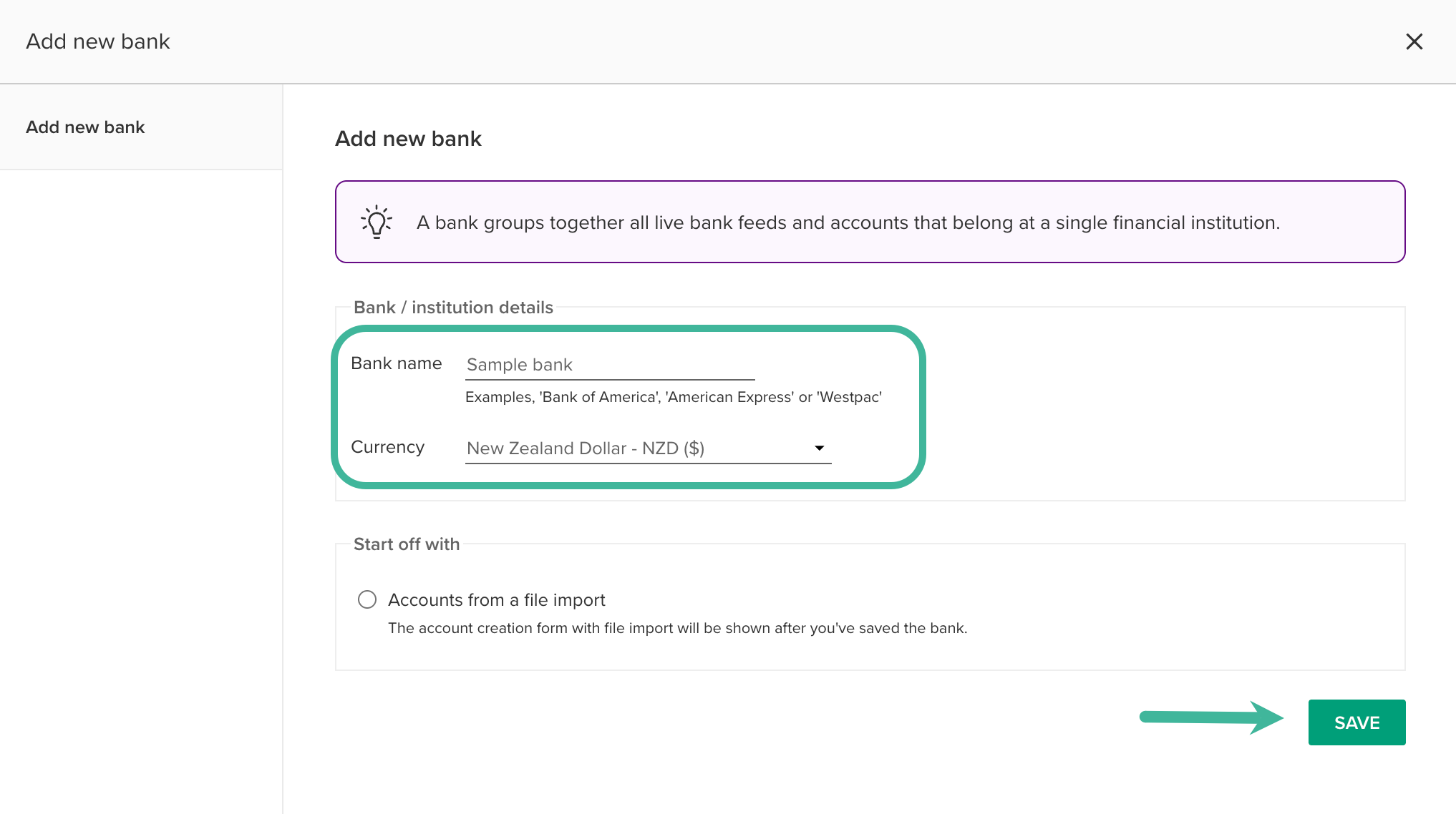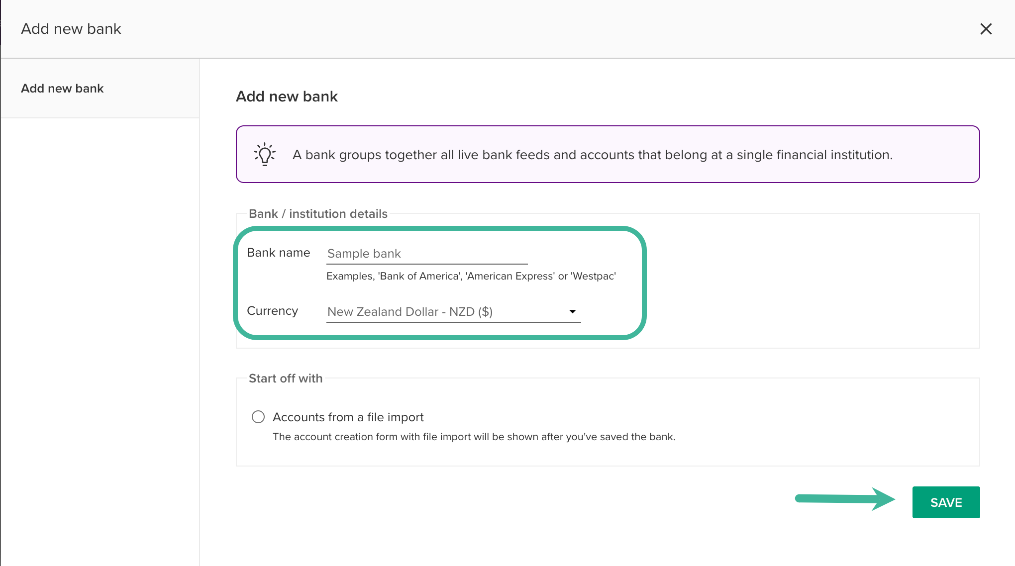 Enter the name for the bank and adjust the currency if needed. Then, click SAVE