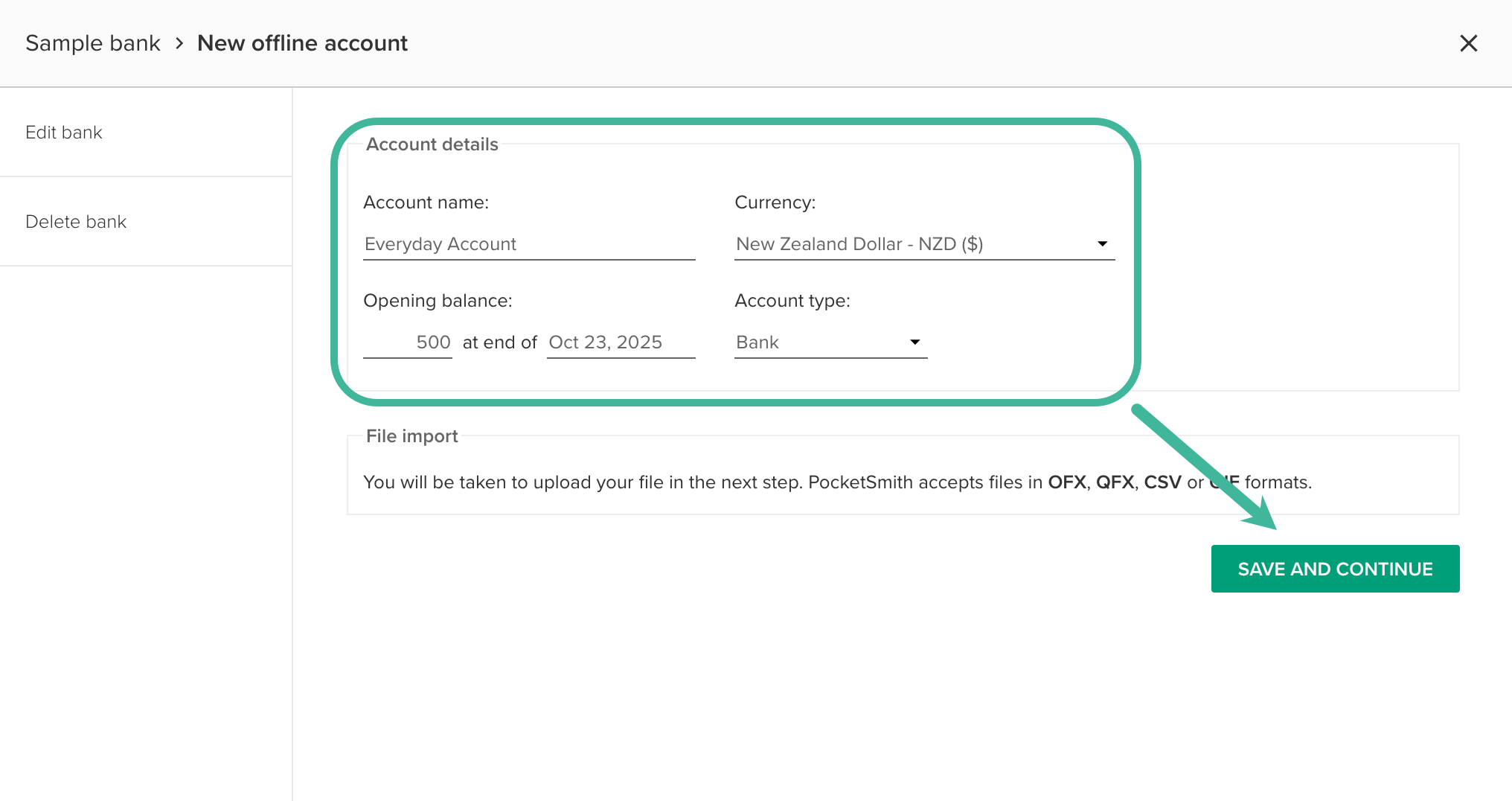 Add a bank account without feeds or bank files, to a new bank within your PocketSmith account